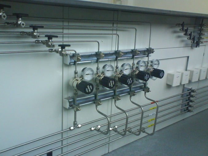 整個管路安裝完畢后,對整個系統做壓力測試,所有彎曲處都要有支撐,我公司提供半導體工廠、科研院所所使用的高純度氣體(O2/Ar/N/H2/He等)、特氣(SiH4/GeH4/PH3/AsH3/SbH3/B2H6/BF3/NF3/PF3/PF5/CF5/CF4/C2H6/C3F8等)綜合供氣系統;排氣處理、監視系統的綜合管理系統;建立以安全為第一的特氣管理輸送系統,由于實驗室氣體管道管路安裝有些儀器需要使用易燃氣體管道氣體管道,如甲烷,乙炔,氫氣,做這易燃氣體管道的管路時,應注意管路盡量短,減少中間接頭的連接,同時,氣瓶一定氣體管道裝入防爆氣瓶柜內,氣瓶輸出端接回火器,可阻止火焰回流氣瓶引起的爆炸,防爆氣瓶柜頂端應有連接到室外的通氣體管道風排氣口,且有泄漏報警裝置,一旦泄漏能及時報警并將氣體管道排到室外。